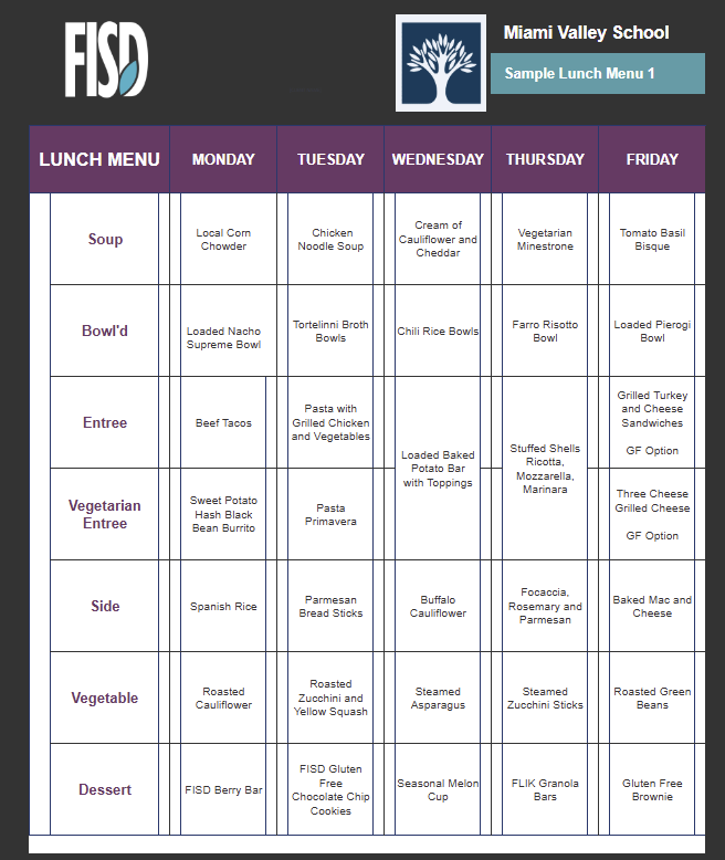 So who even is FISD? According to their website, they are “a dedicated team of compassionate and talented individuals” that deliver “nourishing meals that focus on sustainability, nutrition education, and community impact for the next generation.” And while that looks great, what will actually be served? Below is a picture of what a potential menu could look like: